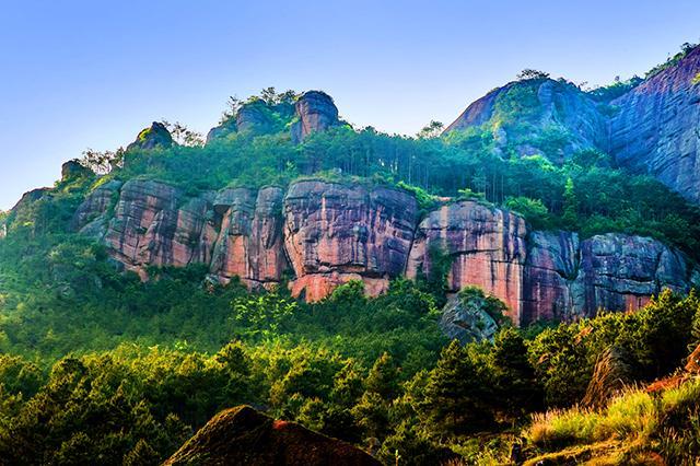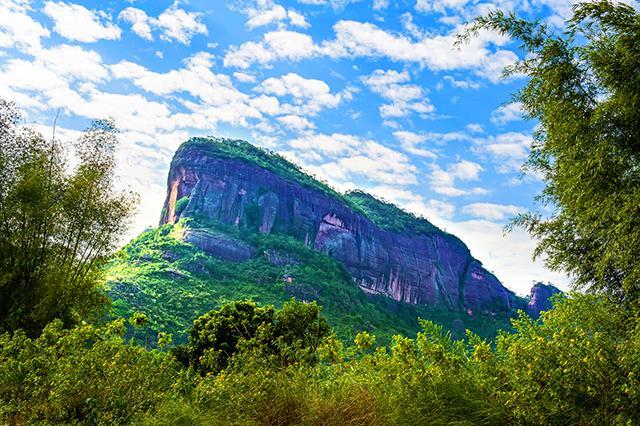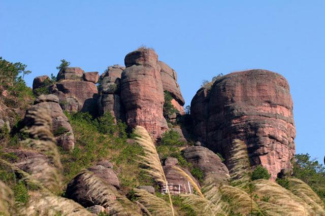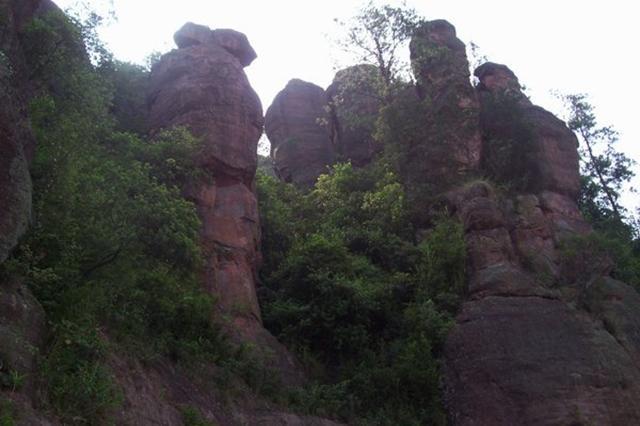 铜石岭分大小二山,远望则像只有一山,圭江自南而北绕过山前。整座山巍峨壮观,石皆紫铜色,造型各异,千姿百态、栩栩如生,最高峰凤凰顶海拔421.9米。