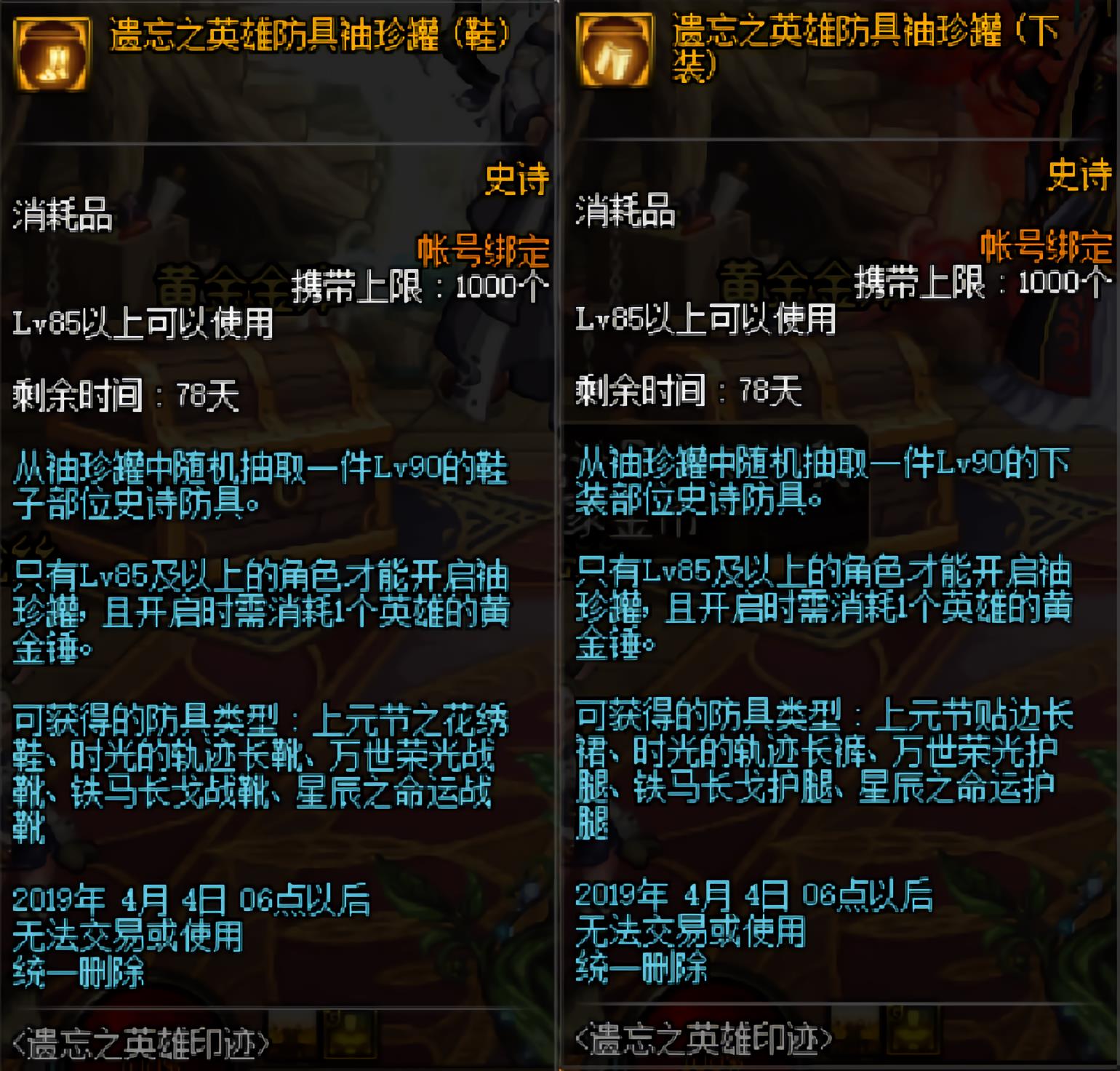 如何获得这个遗忘之英雄装备袖珍罐呢?那么这个袖珍罐是通关春节副本困难模式才能有机会掉落,没错,是随机掉落的,在春节困难模式中或随机掉落精炼的时空石礼袋1个、2个或者10个,星空深渊探测石1个、2个和10个,或者是无尽三件套礼盒,或者就是90级史诗罐子。关于春节副本我们这里不去细说,我们这两天会制作视频分析,开启困难模式需要6天的时间。