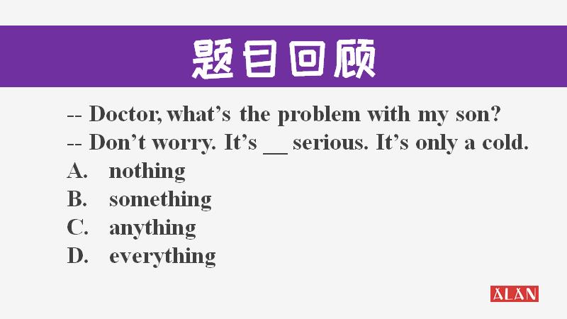 那么就剩下选项A了,秉持着认真的学习精神,除了排除法,我们再从其他角度来解析一下为啥这里要选nothing。nothing表示否定, “It’s nothing serious.”就是“没什么严重的”,医生想向家长传达的意思也是,孩子的病情不严重,所以选项A是正确答案!你做对了吗?