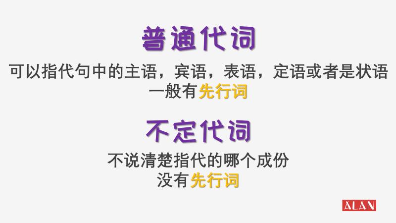 不定代词其实是代词的一个小分支,它们和普通代词的不同在于,它不会告诉你具体指代的是什么,但是你又能从文章和对话中知道它在说什么,具体表现为没有先行词。说到这里,可能有些同学会对先行词不太熟悉,没关系,我先带你了解一下什么是先行词,来看看下面这个句子: