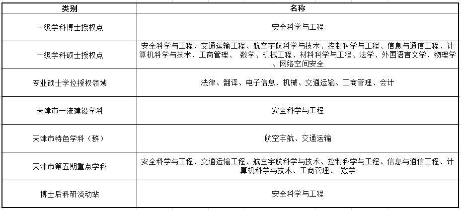 在学科建设方面,中国民航大学有1个一级学科博士授权点,14个一级学科硕士授权点,7个专业学位硕士授权点,1个学科入选天津市一流学科和天津市高校顶尖学科培育计划,3个学科群入选天津市特色学科(群),1个博士后科研流动站。