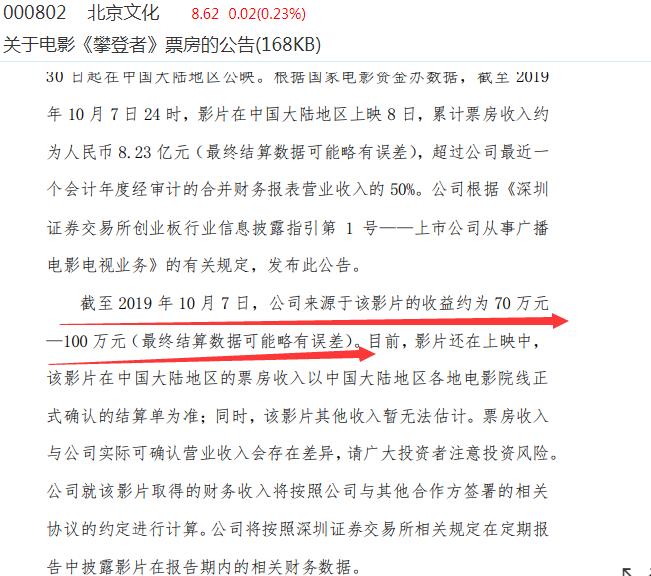 然而,从主要出品方上海影视股份有限公司和北京京西文化旅游股份有限公司发布的公告中可以看出,《攀登者》并没有赔本,也没有像网站上传闻的那样“投资5亿”,电影在10月6日就已经回本,开始赚钱啦。