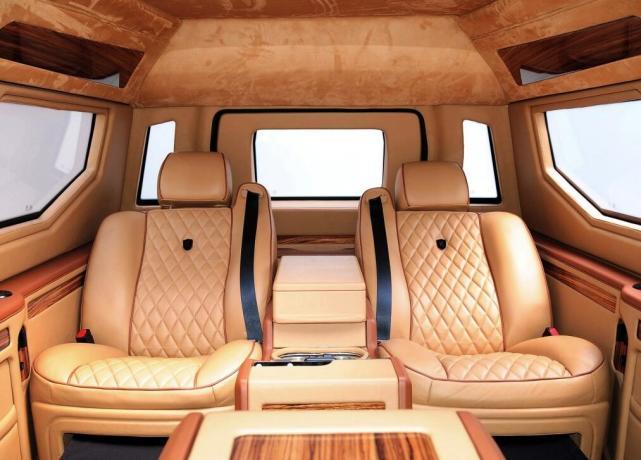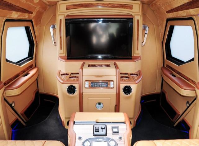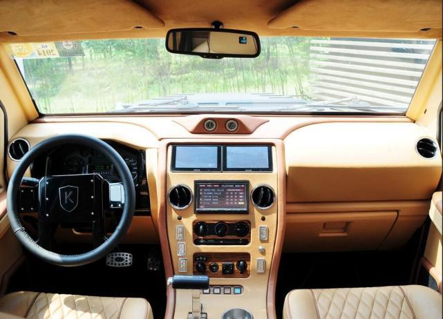 进入骑士十五世的车内,一股豪华感铺面而来,与车外坚硬粗糙的装甲截然不同的是车内使用了大量的细腻柔软真皮包裹,凡是触手可及的地方都是棕色真皮,连车顶都包裹上了反绒鹿皮。据厂家介绍骑士十五世所使用的真皮与劳斯莱斯一样,同是安德鲁缪尔海德皮革。