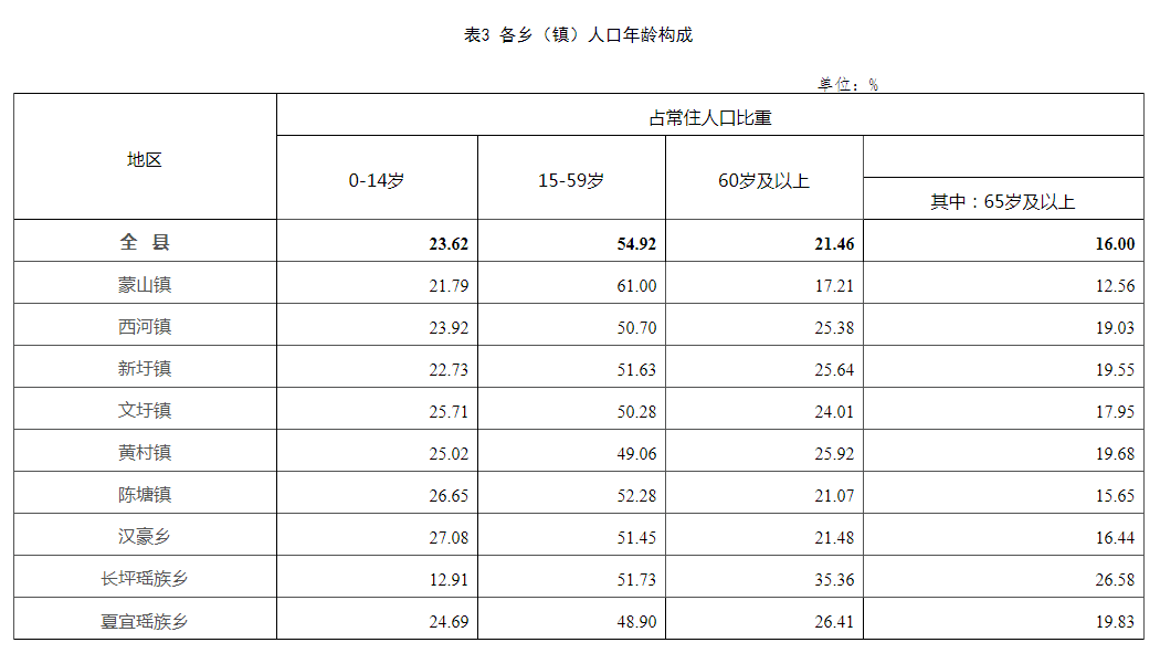 全县常住人口中,0-14岁人口为38832人,占23.62%;15-59岁人口为90297人,占54.92%;