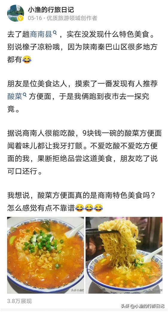可是我们在县城逛了一圈儿,并没有发现商南有什么特色美食。最后好不容易找到一种泡菜方便面的美食,但感觉和陕南特色不搭边儿。于是我就发了一条动态,和朋友们谈论起商南特色美食的事儿。
