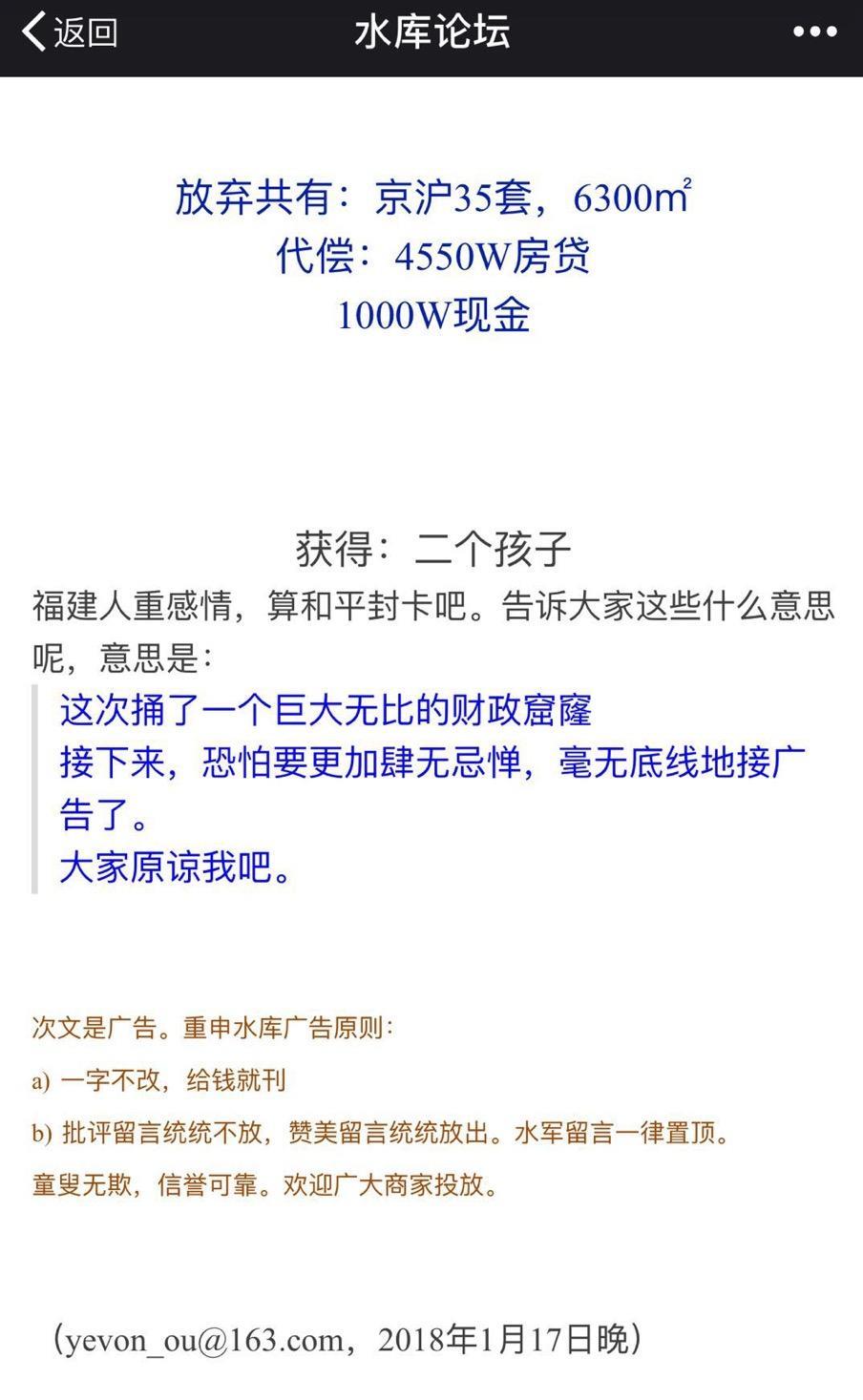 先不说房子,说说普通人的离婚。水库的欧神在多军炒房客眼中是神一般的存在,但是很不幸他依然是普通人,在有钱人眼里依然不算什么就是个普通人,普通到也会经历离婚。今天欧神在自己的阵地水库论坛里发布了一下他离婚协议的一些细节。
