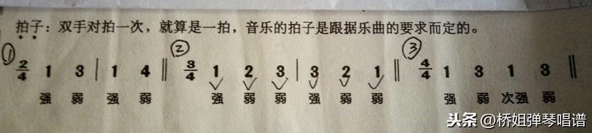 四二拍:第一拍强、第二拍弱;四三拍:第一拍强、第二、三拍弱;四四拍:第一拍强,第二拍弱,第三拍次强