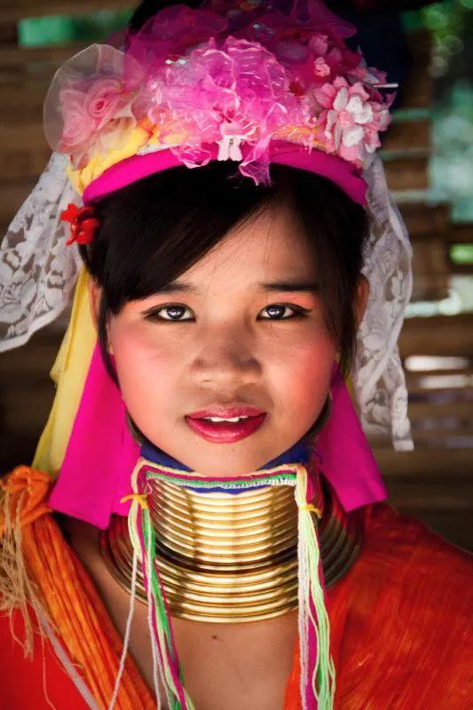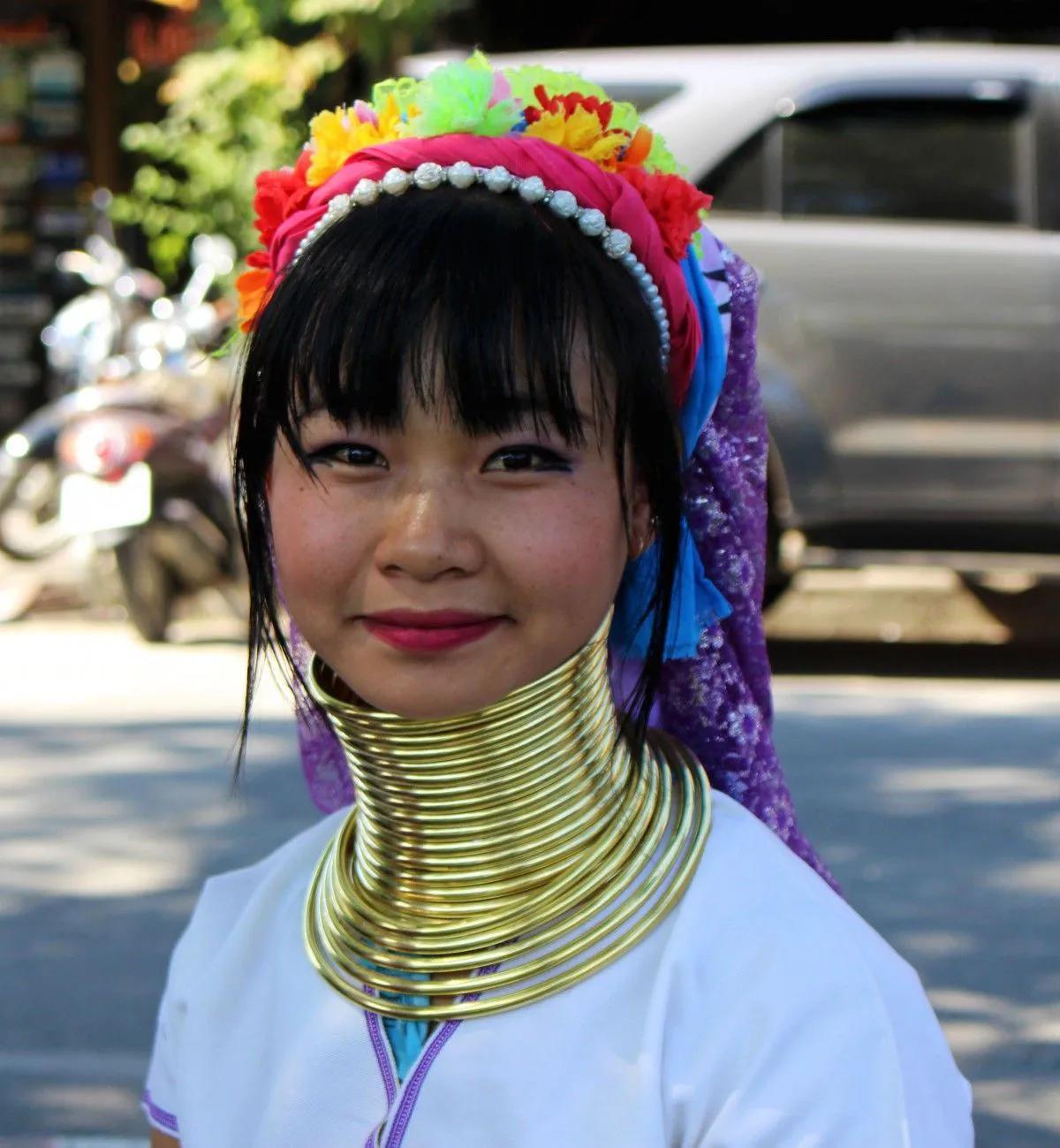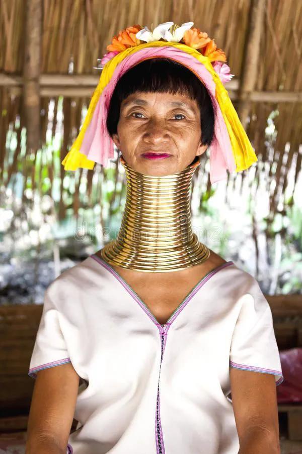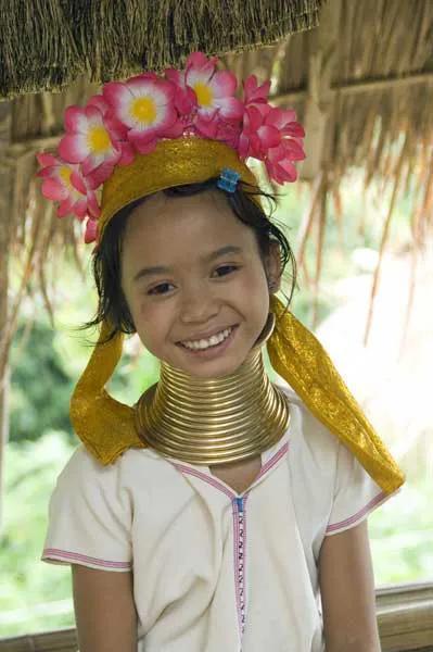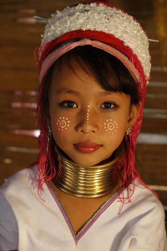长颈族人以脖子长为美。通常,女孩从5-6岁开始在脖子上佩戴铜环。每年逐步增加,使脖子拉长。有的女性佩戴的铜环可以达到25个。