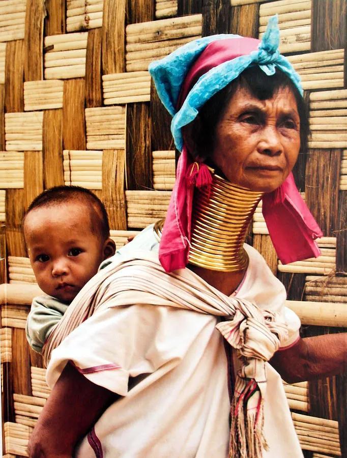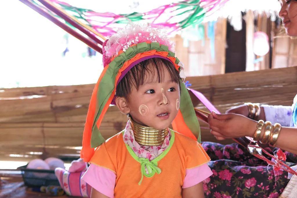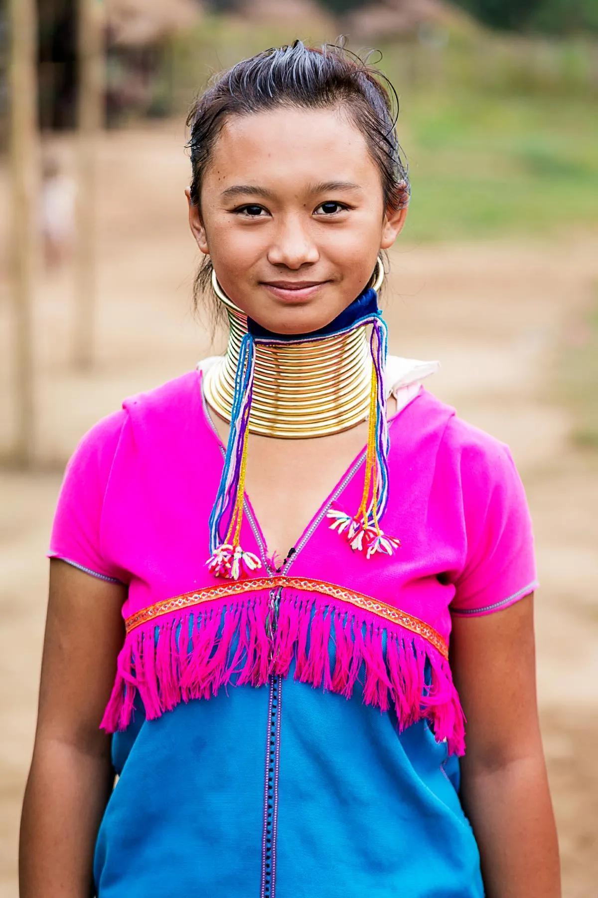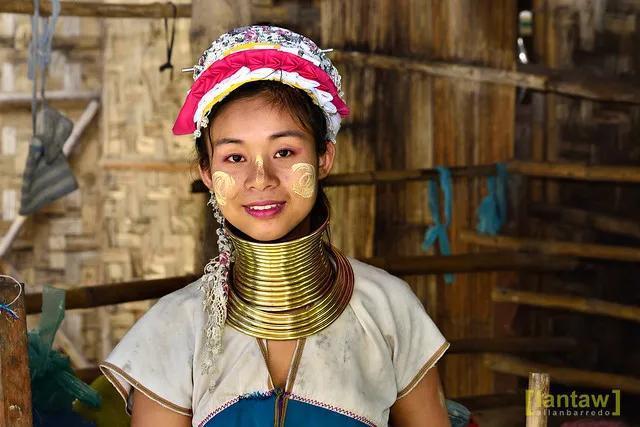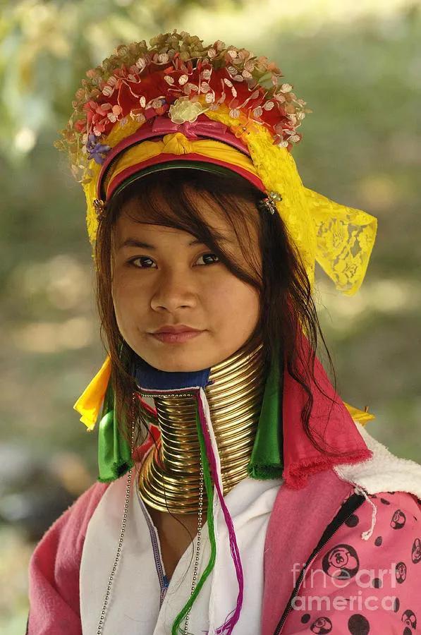 长颈族人以脖子长为美。通常,女孩从5-6岁开始在脖子上佩戴铜环。每年逐步增加,使脖子拉长。有的女性佩戴的铜环可以达到25个。