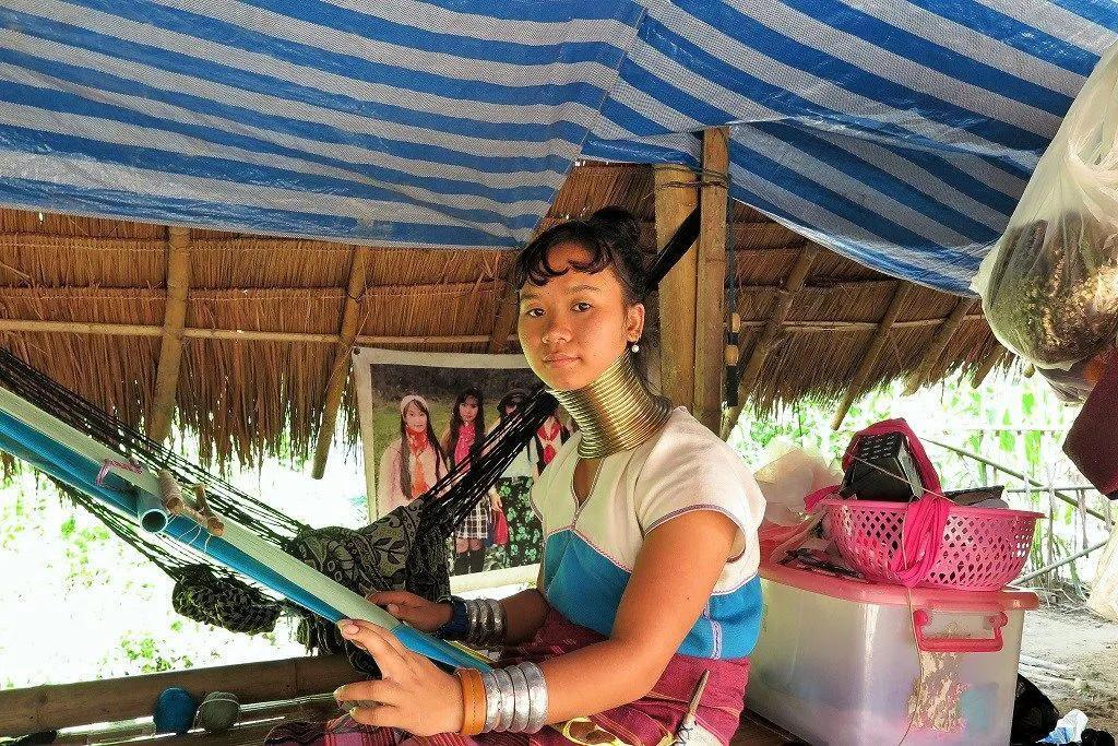长颈族的女人,勤劳朴素。年轻女性脖子上佩戴的铜环还不是特别多,脖子也不是太长,因而年轻的长颈族女性也依然很美。