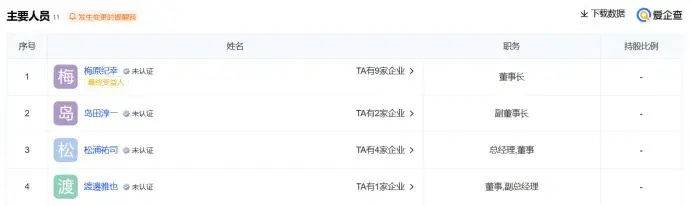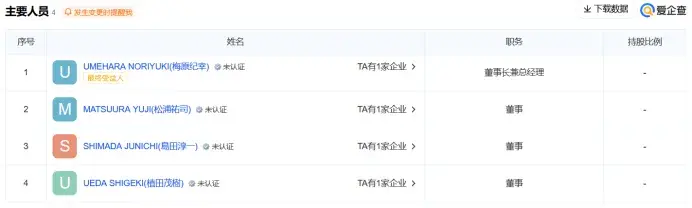 如果有心去了解一下就会发现他们的法定代表人均为“梅原纪幸”,并且其相关人员架构都是一样的。