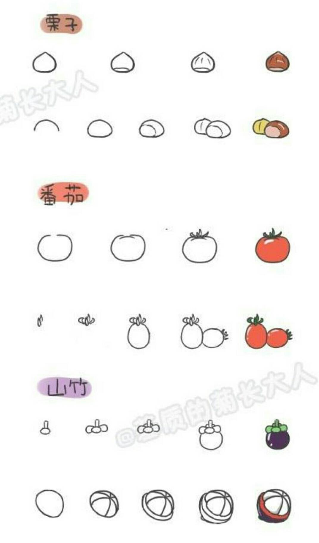 接着是一颗栗子的画法,一个大番茄的画法,两颗小番茄的画法,一整个山竹的画法和剥去一半皮的山竹的画法。