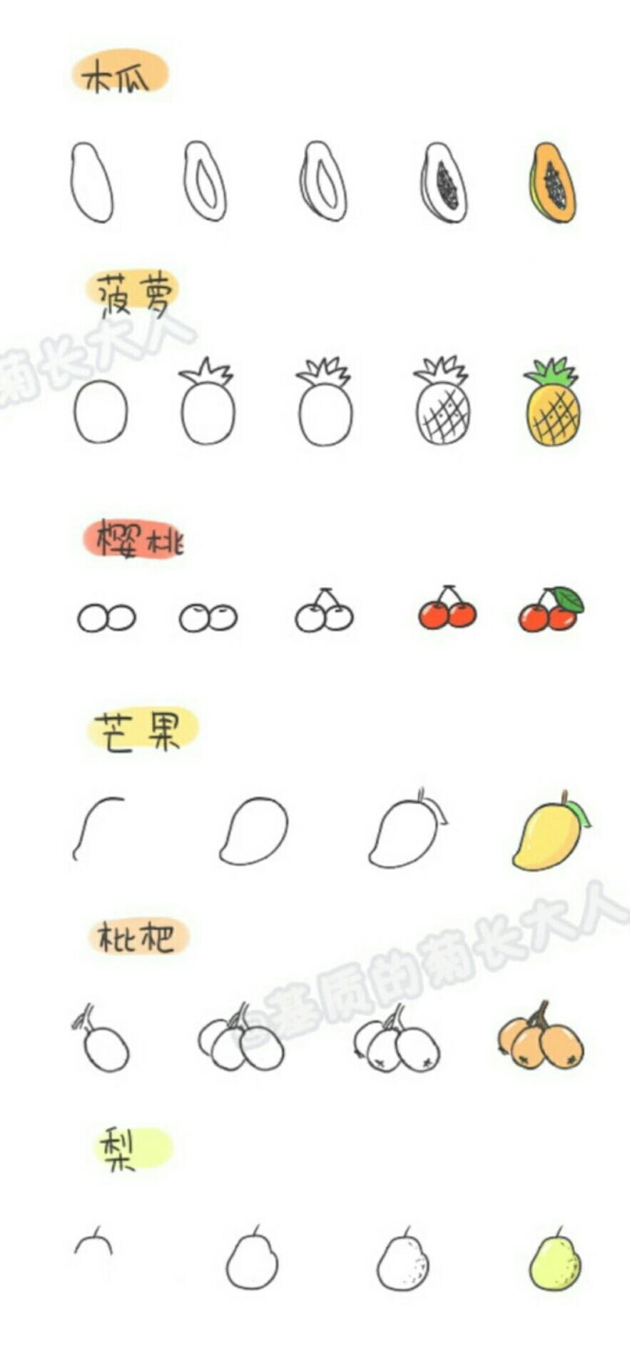 接下来是一半哈密瓜的画法,一个菠萝的画法,一小串樱桃的画法,一个芒果的画法,一串枇杷的画法,一个梨的画法。