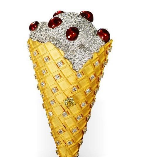 由美国的一家名喊“Bruster’ s Real IceCream”的公司推出钻石冰淇淋,它和阿诺冰淇淋有异曲共工之妙,它的奶油局部运用钻石镶嵌,个中还有几颗宝贵的红宝石,而它的蛋卷局部则是用黄金和白金挨造而成,所有冰淇淋瞅起来格外的刺眼,然而痛惜的是它只可参瞅.