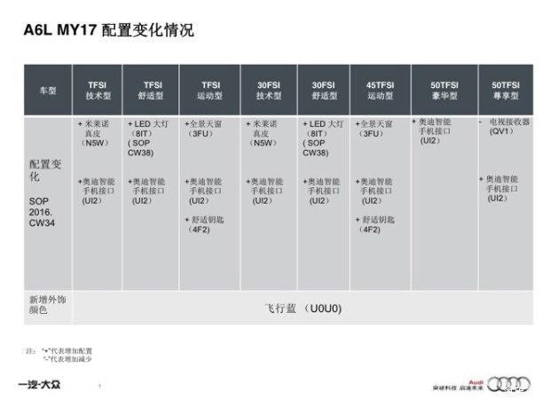 豪华轿车品牌最新消息:日前,小编获悉一汽-大众奥迪官方宣布,2017款奥迪A6L正式上市,售价区间为41.88-74.60万元。新车依然推出8款车型,全新奥迪A6L配置和颜色都进行了小幅的升级,售价有小幅调整。奥迪A6L详细售价请见下表: