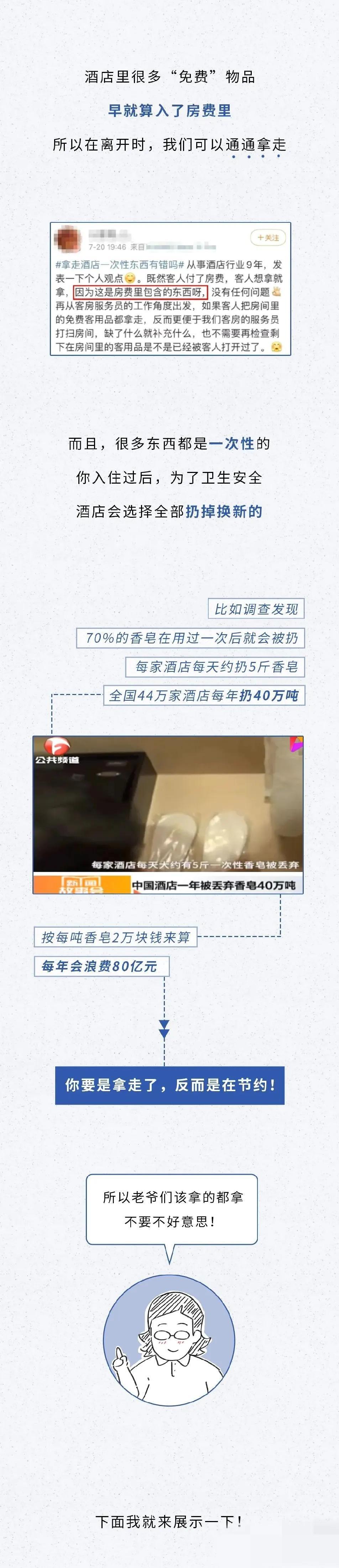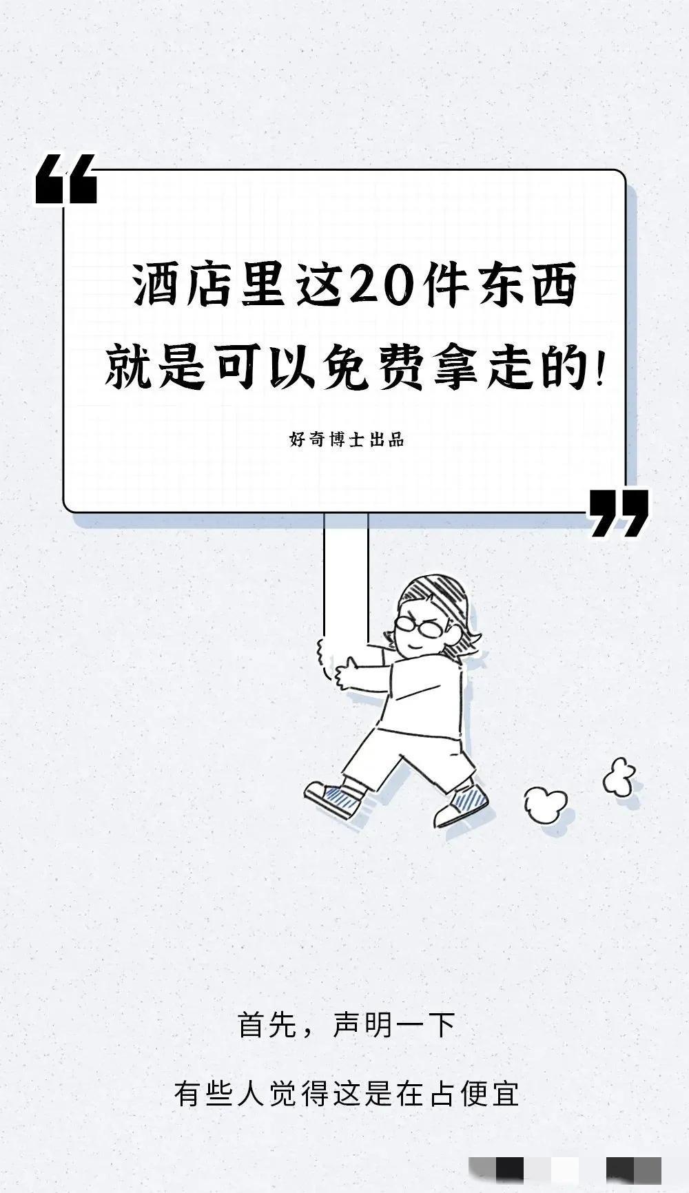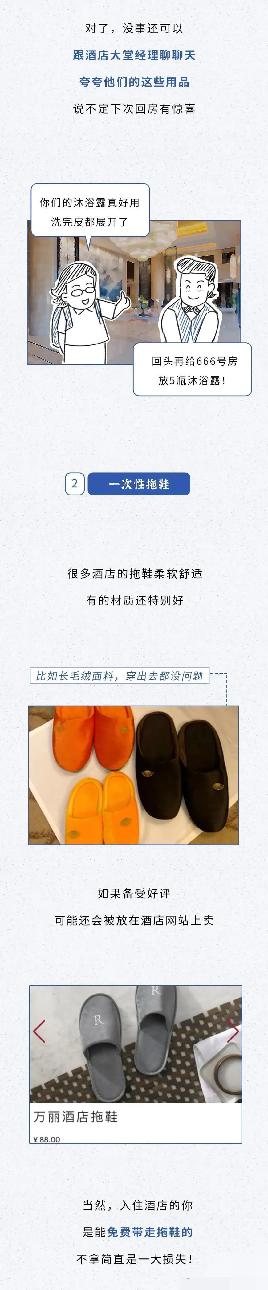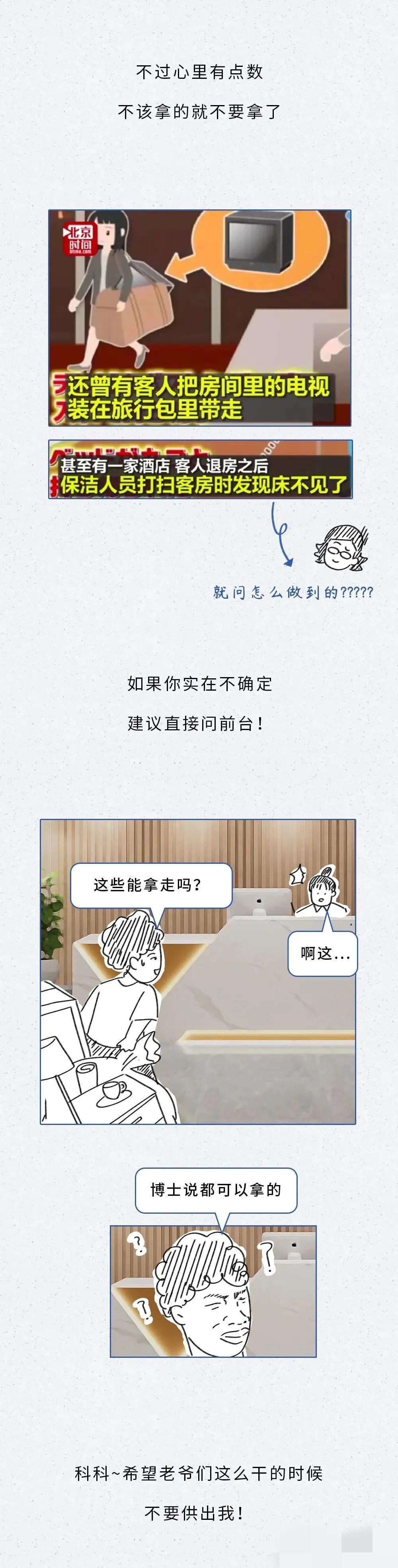 酒店里还有很多的用品都可以直接打包带走,那么还有哪些用品呢?请大家一起看下面的漫画。