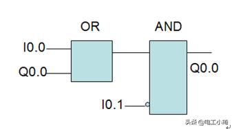 它由两个功能块组成,一是逻辑“或(OR)”功能块,一是“与(AND)”功能块,其逻辑关系式I0.0与Q0.0相或,或的结果在与I0.1的非(图中用—0表示)相与,结果为输出Q0.0如果用逻辑或表示,为: