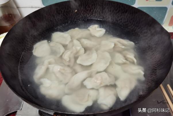 5,锅中倒入足量的水,烧开后下饺子,用铲子轻轻的推动,煮沸后再次加水,煮至饺子肚子翻过来,就熟啦,盛出开吃吧!