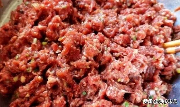 1,把牛肉剁成馅。牛肉有比较大的膻味,(如果不喜欢这味儿,可以加点花椒水,花椒水去牛肉膻味的效果不错)。加适量的姜末、蒜末、料酒、生抽、盐,搅拌均匀。牛肉馅搅上劲之后,放一旁备用。