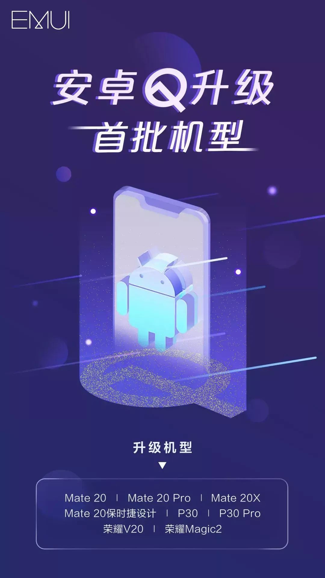 5月9日,官方正式公布首批8款升级机型表,包括华为Mate 20、Mate 20 Pro、Mate 20 X 、Mate 20保时捷设计、华为P30、P30 Pro、荣耀V20和荣耀Magic2。