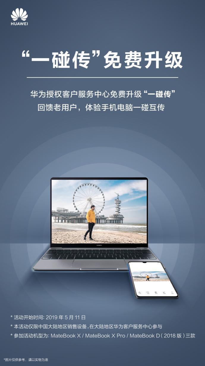 5月11日起,MateBook X Pro/MateBook X/MateBook D(2018款)老用户可携带电脑至华为客户服务中心免费安装#Huawei Share 一碰传# 标签,感受全新一碰传功能。