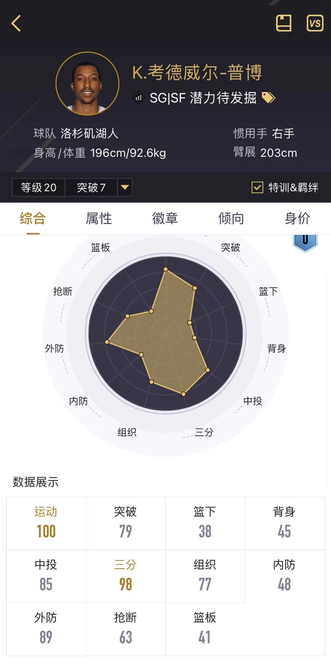 K.考德维尔-普博:新版本中他的三分可达到100,外线防守可达到90+,是一个很不错的3D球员。