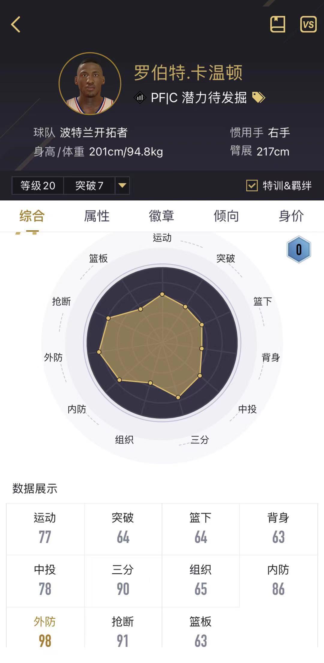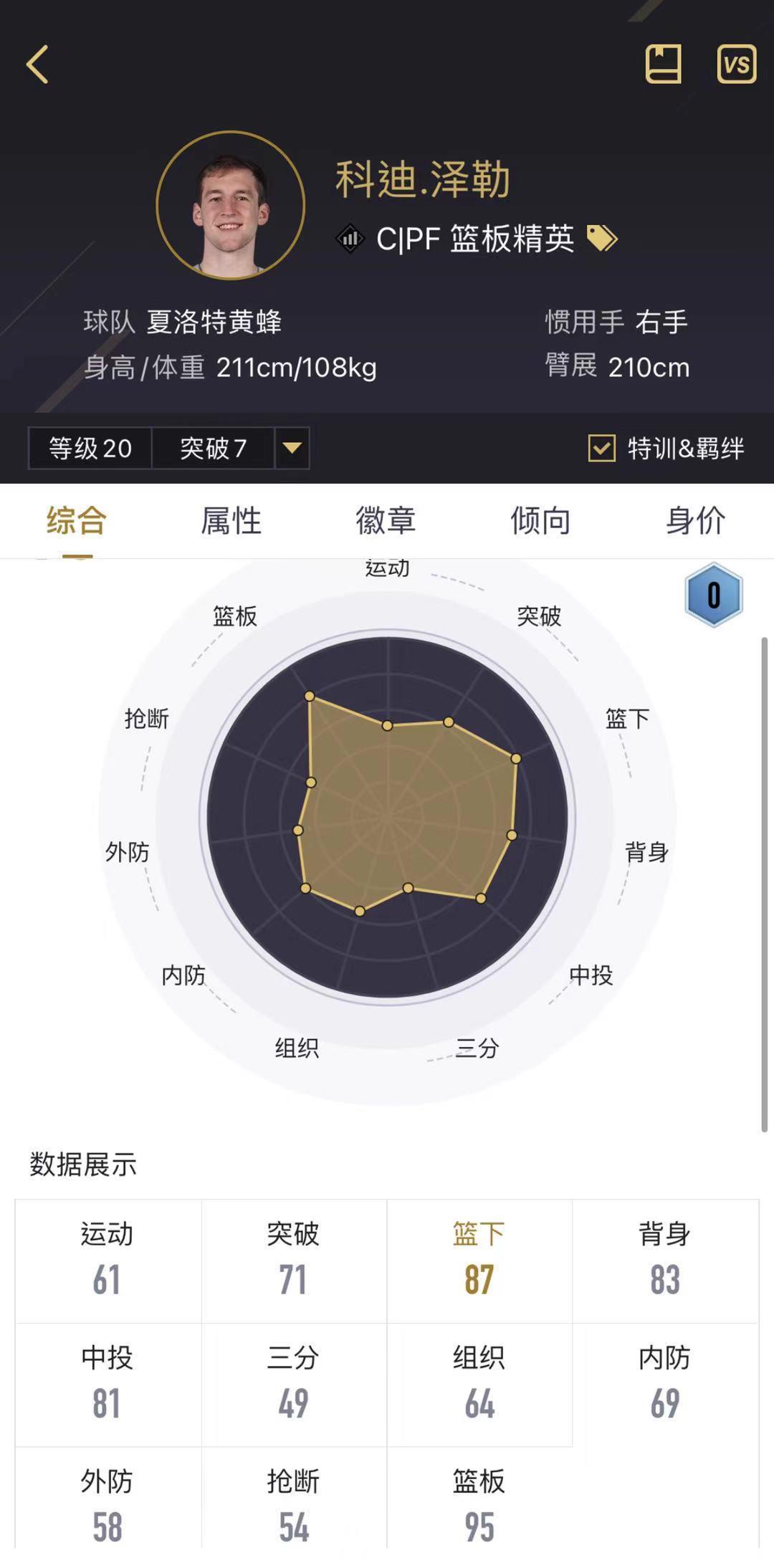 科迪-泽勒:注意,这是黄蜂的泽勒。他的定位很清楚,一个弱队里面的首发中锋。身高211,臂展210公分,有着一个不错的身高和臂展,模型方面相对于来说比较偏小。三项篮板数据是92、97、92,但人家弹跳也有94,一个213的大个子有94的弹跳,这就很不错了。徽章方面有一个铜色铜墙铁壁徽章,一个补篮之王铜色徽章,配合铜墙铁壁徽章,可以有效的起挡拆的作用,空位中投也有81,有时候还可以偷鸡,满突身价80W,如果队里缺一个篮板手,泽勒是挺好的选择。