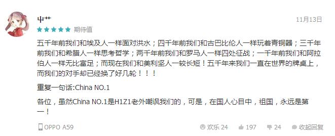 在游戏圈里,没什么能比"China NO.1"这个口号更容易调动广大玩家的情绪了。无论你是中国玩家还是老外玩家;无论你唾弃这个口号还是赞美这个口号。即使你离开这个口号的发源地《H1Z1》,在其他可以与老外玩家同台竞技的游戏里,你仍然能听见它。它不知不觉中已经成为了游戏文化圈的一个符号。