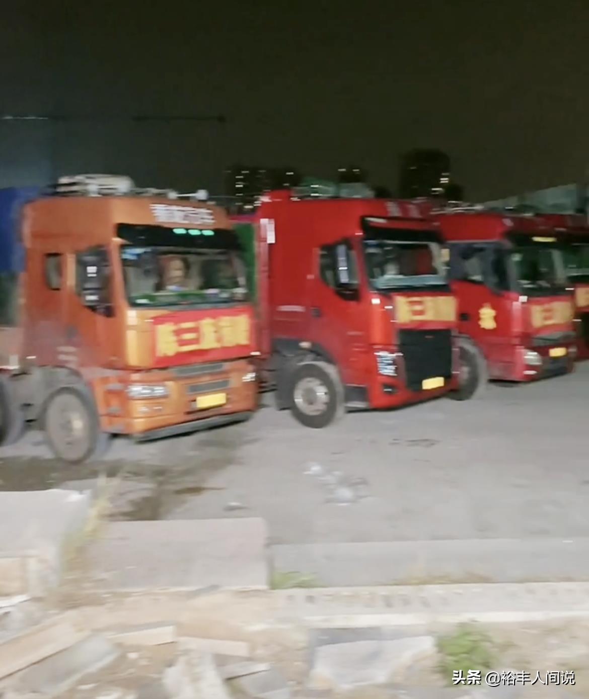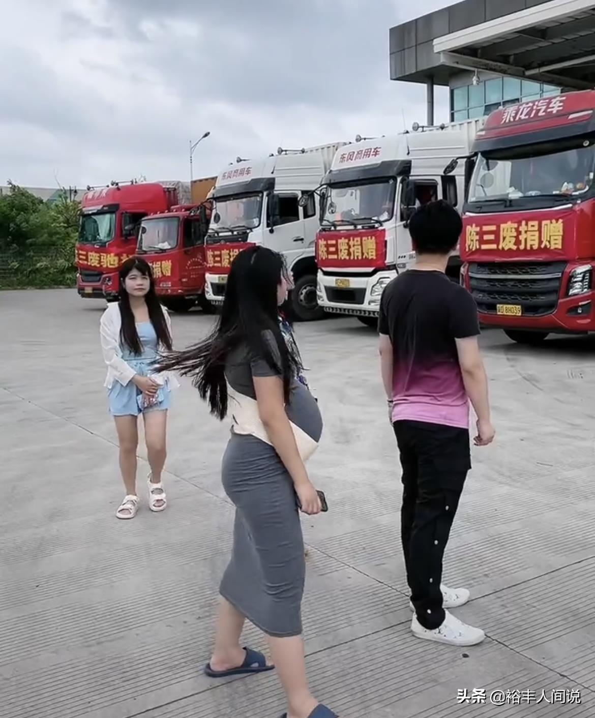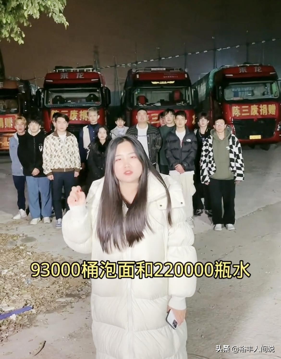曝光的画面中,陈三废的姐姐陈婷站在队伍的最前方,后方则站着团队的工作人员,大约有10几人,再往后则是数辆卡车,细细数来,差不多有8辆之多,每一辆卡车的车头都挂着“陈三废捐赠”的条幅。