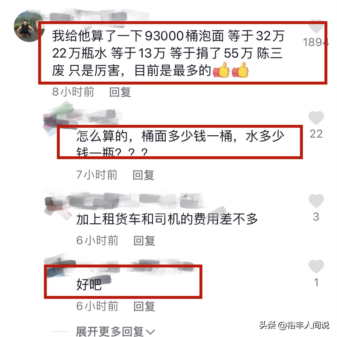 不得不说,陈三废团队的这个行为真的很正能量,这些物资折合成人民币,大约在50多万(以零售价来计算,加上各种费用),在所有的广西网红当中,应该属于最具社会责任感的直播带货网红。
