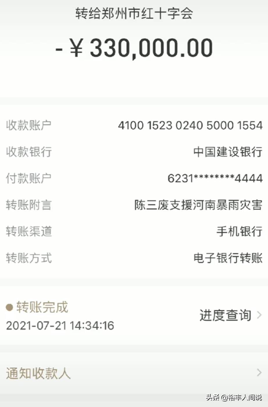 据了解,陈三废团队自从成名之后,所做的善事并不仅仅只有这次捐助广西百色,河南灾情、湖南疫情期间,陈三废团队也是紧急筹备物资,运送到一线,尤其是河南灾情期间,陈婷代表陈三废整个团队,捐赠了33万的现金。
