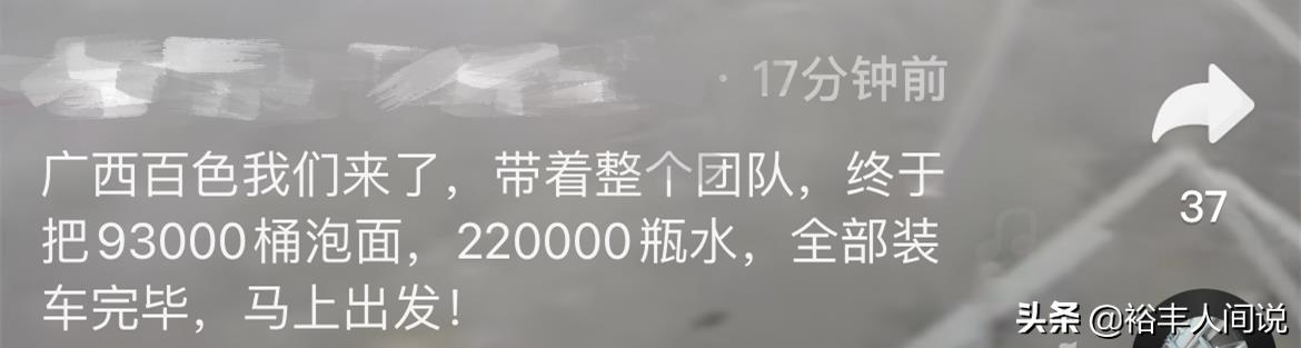 2月10号,陈三废团队在视频账号上分享运送物资的状况。并留言说道:“广西百色我们来了,带着整个团队,终于把9.3万桶泡面,22万瓶水,全部装车完毕,马上出发。”