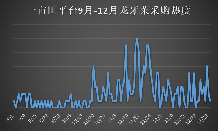 在一亩田,也有很多用户关注龙牙菜这类“新奇特”品种。9月份之前,由于不是龙牙菜上市期,所以暂时没有采购需求。9月之后,龙牙菜采购热度逐渐上升,在11月中旬和12月下旬,一亩田上龙牙菜的采购热度一直居高不下,出现采购热度高峰期。