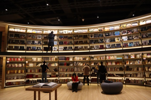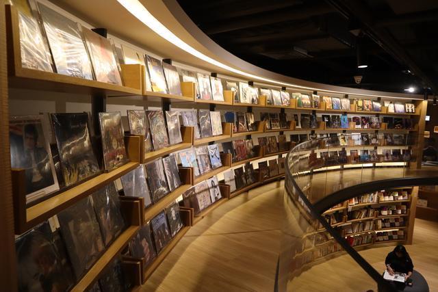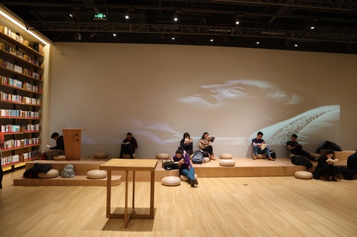 一层是阅读空间,藏书包括艺术、文学、历史、经济、哲学等多领域。中间是大屏幕,播放电影。