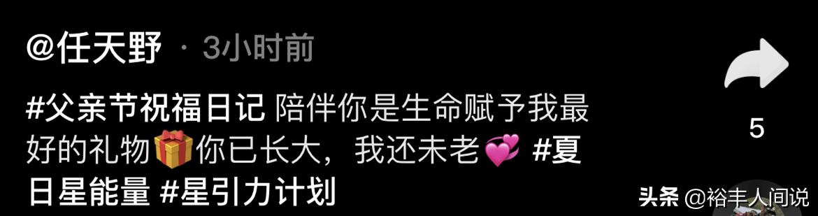 任天野在留言处柔情地说道:父亲这个称呼我当了15年,陪伴你是生命赋予我最好的礼物,你已长大,我还未老,我会永远陪你奔跑。