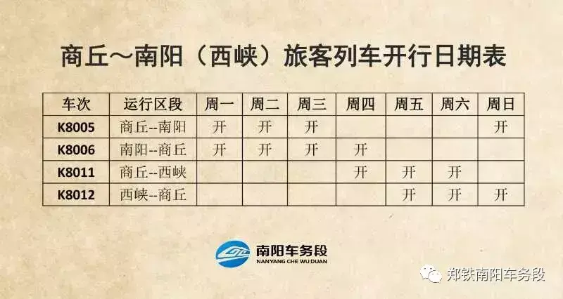 K8011次由商丘自6月8日起每逢周四、五、六开行;K8012次由西峡自6月9日起每逢周五、六、日开行。