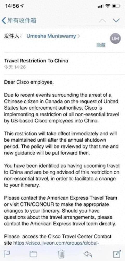 在去年12月孟女士被困加拿大事件发生之后,新闻和舆论对拘捕行为口诛笔伐之际,12月8日,一则不太显眼的消息跳入人们的视线之中:思科被曝限制员工到中国出差。邮件的核心内容为思科集团限制员工对中国进行非必要的出差。这项限制立刻生效,且会延续到公司年底放假,政策将会在那时进行重新评估。
