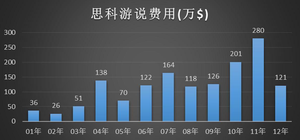 除了国会议员的投资思科之外,思科还对政党或者议员进行捐款,根据美国《美国政治捐献数据库》的数据,11-12年给奥巴马捐款11.7万美元,给美国大选总共捐了超过100万美金。在捐款之外,还有就是游说费用,从1998年到2012年,思科总共花了1570万用于政府的游说,并且在03,04及11,12年形成了两个高峰,而这两个高峰,可能就是和思科诉讼及华为调查相关,特别是11年的高峰。