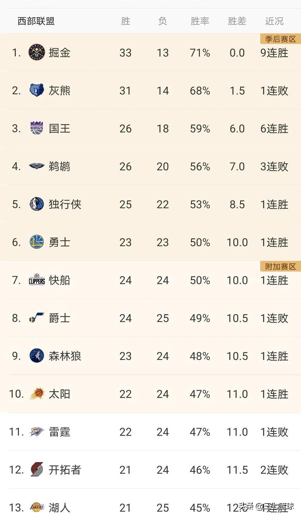 湖人13,马刺14,火箭西部垫底。
