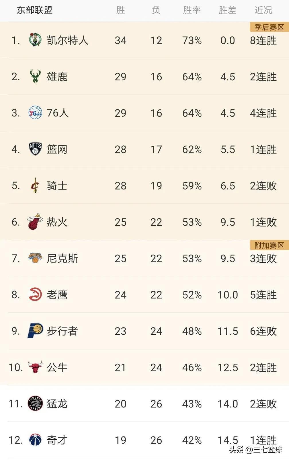 11-12名依次是:步行者,公牛,猛龙,奇才。