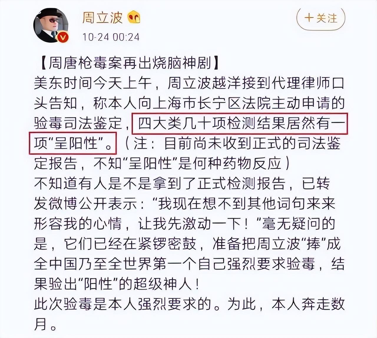 之后,周立波遭来了一次极其“打脸”验毒,周立波强烈要求给自己验毒,但是经过上海长宁区人民法院的检验后,周立波被检出阳性。