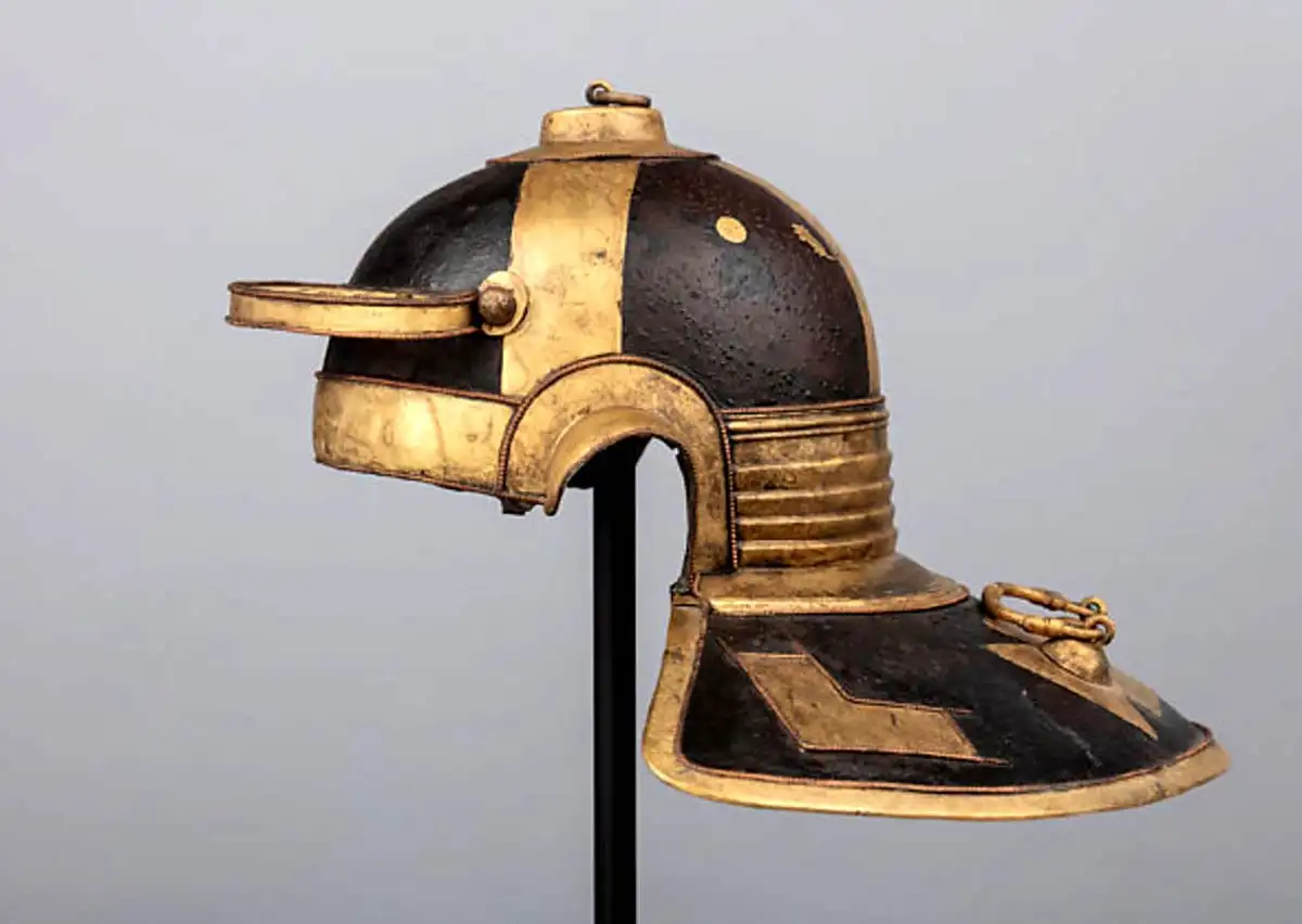 罗马青铜骑兵头盔,公元1世纪,通过大英博物馆;与富勒姆剑,公元1世纪初,通过大英博物馆;和铁矛头,公元1世纪,通过大英博物馆