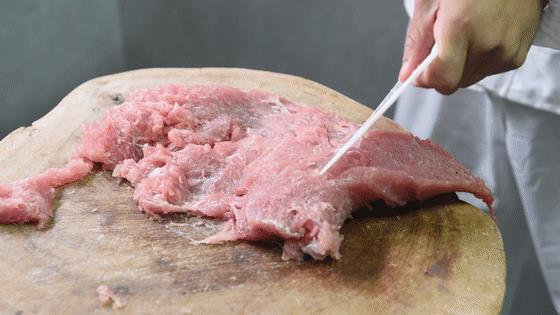 首先,按照肉的纹理将它们片开,为接下来的工序做准备。