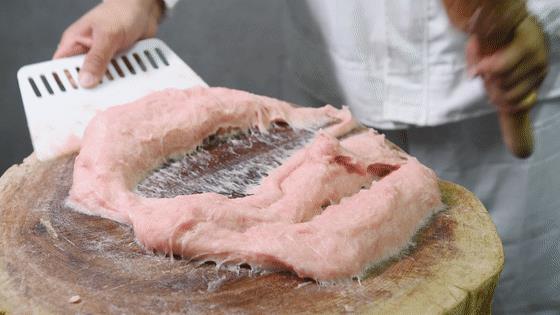 这不是表演,更不是毫无章法地使用蛮力,而是借用巧劲,利用有节奏感的反复敲打,直到将猪肉原有的生理结构完全打碎。