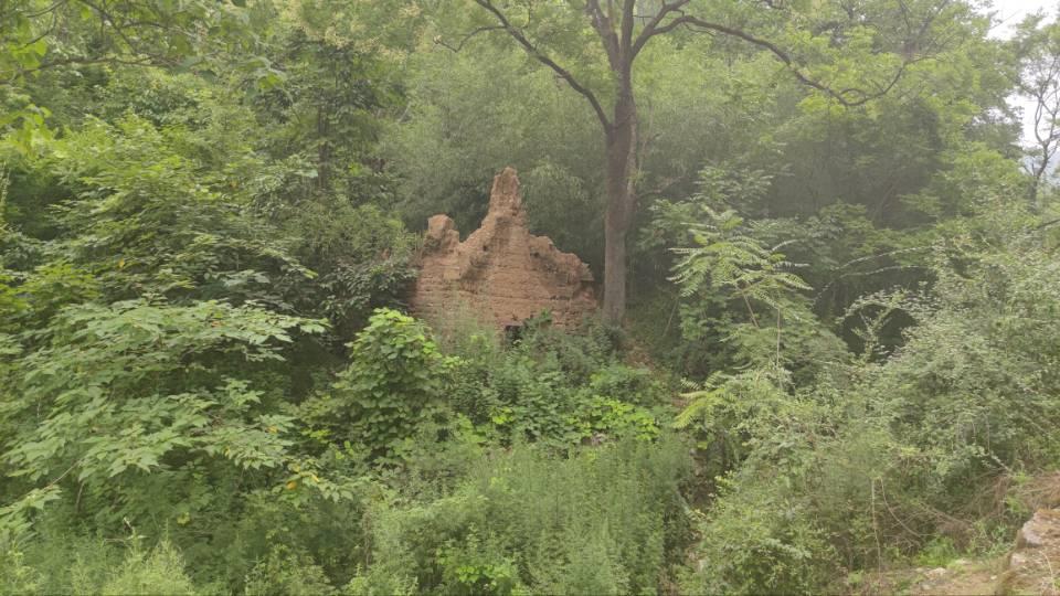 又走了一段,沟的另一面的树林里出现了一面残破的土墙,呈三角形,在雾里朦朦胧胧的。