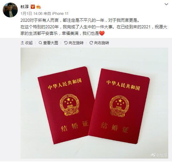 今年1月1日,新年第一天突然发文晒出结婚证的杜淳,一时间震惊不少吃瓜群众,毕竟在此之前杜淳并未官宣恋情,也很少在社交平台提及感情生活,不少人还以为他是单身,没想到这么快就结婚了。