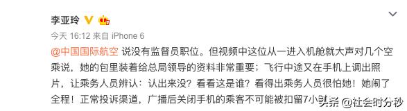 李亚玲@中国国际航空,回应称,从视频中可以看出空乘人员很怕这个人,而正常投诉渠道,广播后关闭手机的乘客不可能被扣留7小时!李亚玲表示,当天上午发出视频后,国航小秘书发来私信询问手机号和机票号,表示会调查,但“目前还未得到官方回应”。13日晚间,国航将这条声称“国航从未设监督员”的评论删除了。