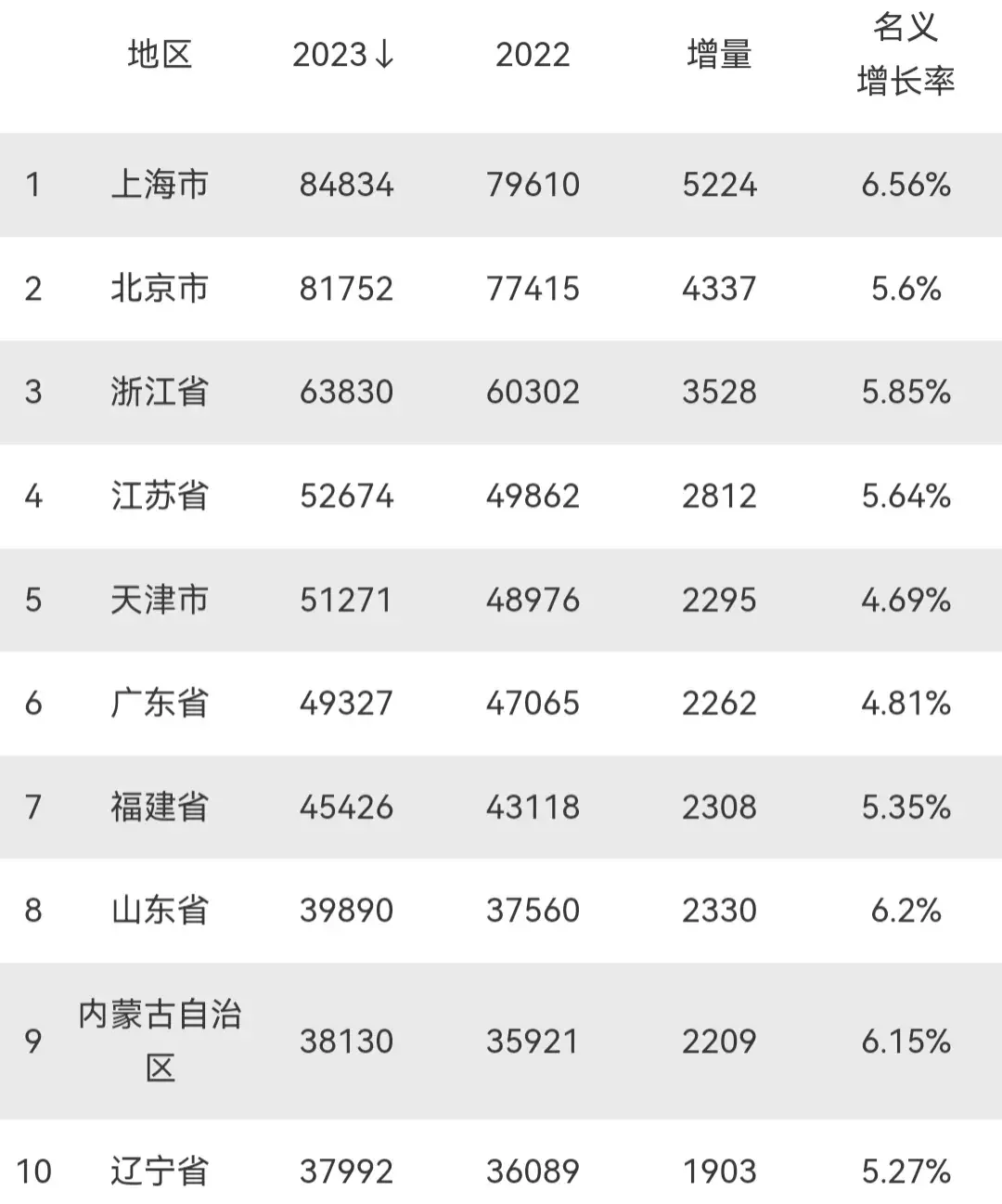 根据2023年人均可支配收入的高低,我国民富水平10强省出炉,依次为上海(84834元)、北京(81752元)、浙江(63830元)、江苏(52674元)、天津(51271元)、广东(49327元)、福建(45426元)、山东(39890元)、内蒙古(38130元)、辽宁(37992元)。