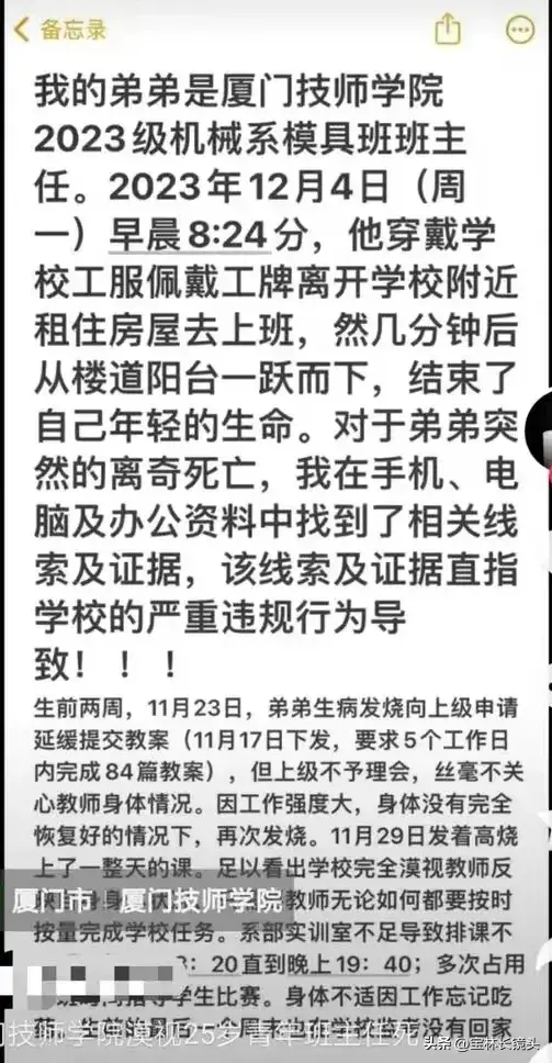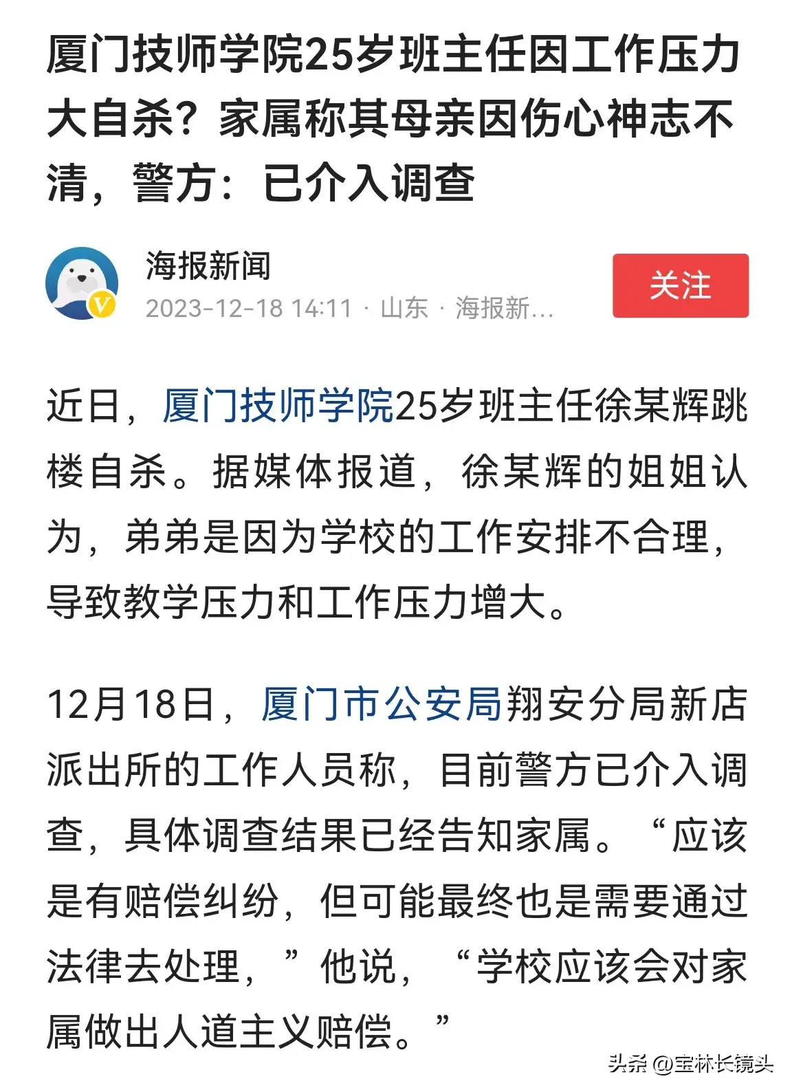 这一悲剧过去不到两个月,厦门一25岁男教师(班主任),又因学校工作安排不合理,导致工作压力过大,近日跳楼自杀。