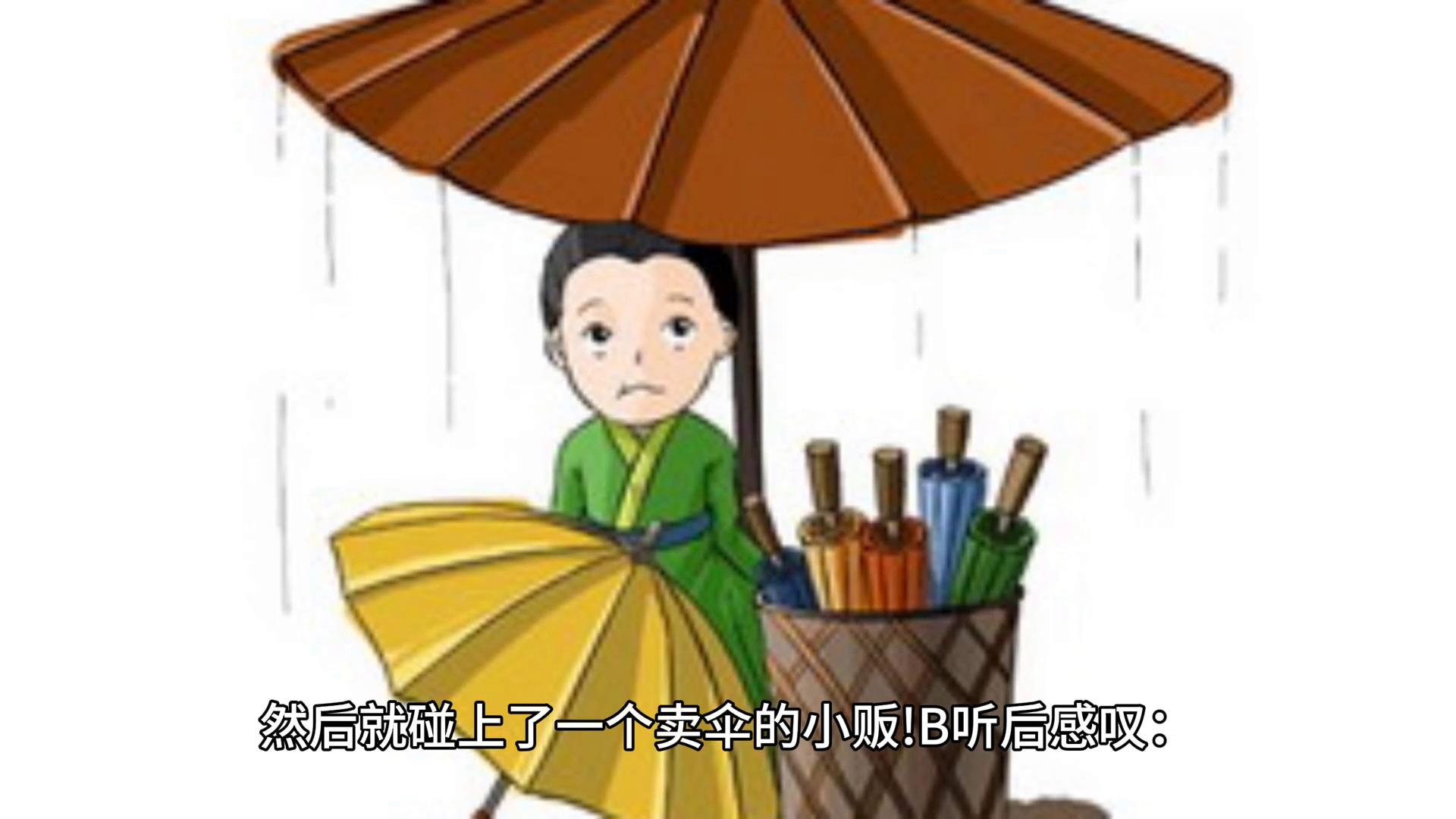 ·3.两个朋友在路边闲聊,A说:“昨天晚上突然下大雨把我淋湿透了。”B问:“那怎么办?”A回答:“只好走路,然后就碰上了一个卖伞的小贩!”B听后感叹:“真是机缘巧合啊!”